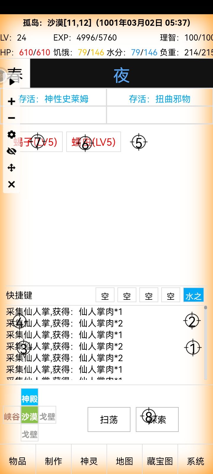 3、找到神殿后,做神殿任务买回城劵,选择附近的沙漠地图并进场清掉资源,然后打开连点器开刷,建议①放在♦️,②放在♠️,③—♥️,4—♣️,⑤放在三号怪位置,⑥在二号怪位置,⑦在一号怪位置,⑧放在探索