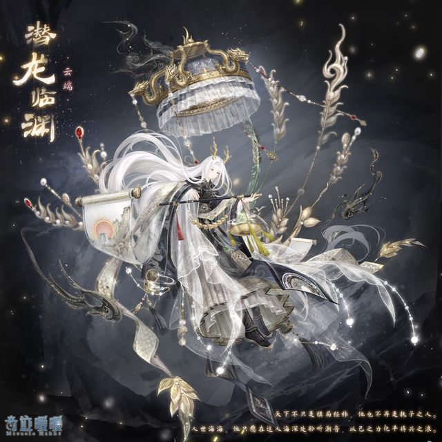 【潜龙临渊】含正常姿势与特殊姿势,全新妆容“尘海淘沙”,特效华服“潜龙临渊”,精美角饰“点辉金光”,动态摆件“故笔游龙”,特效摆件“松风入鼎”、“烟影华阑”,精美可移动摆件“千金一逢”,达成套装成就可领取特殊姿势部件。
