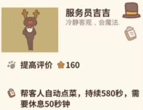 优先升级服务员吉吉:吉吉可以帮顾客自动点菜,就不用自己一个一个给顾客点菜了,吉吉等级越高,挂机的时候就能招待更多的顾客,赚更多的小鱼干。