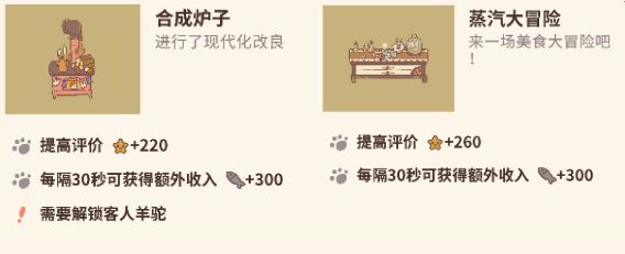 优先购买橱柜、料理台、装饰物:这些设施也是需要选择性购买,多比较一下,哪些便宜又能带来高收益,前期小鱼干不多的话,就选最便宜的六个炉子安排上,不要着急购买好的炉子,因为顾客一般都会等你把菜做好再走,到了后期有小鱼干就可以陆续换好的炉子,加快赚小鱼干的速度,餐厅区也是一样哦!把好餐桌购买往后稍稍,甜品酒柜咖啡厅统统安排上。
