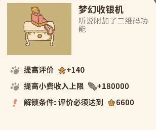 选择性购买小费台:刚开始玩可以购买优雅收音机,小费上限是180000小鱼干,即典雅又性价比高,解锁条件也是只需要6600星,还是比较容易达成,节日期间出的餐具也是性价比比较高的,如果心仪的话也是可以冲的,小费台的收益也是累计增加的,在下线的时候要记得把小费台收干净,明天一打开游戏看个广告有是一笔不少的小鱼干收入,建议不要频繁收小费,存满了再收,这样节省广告次数。