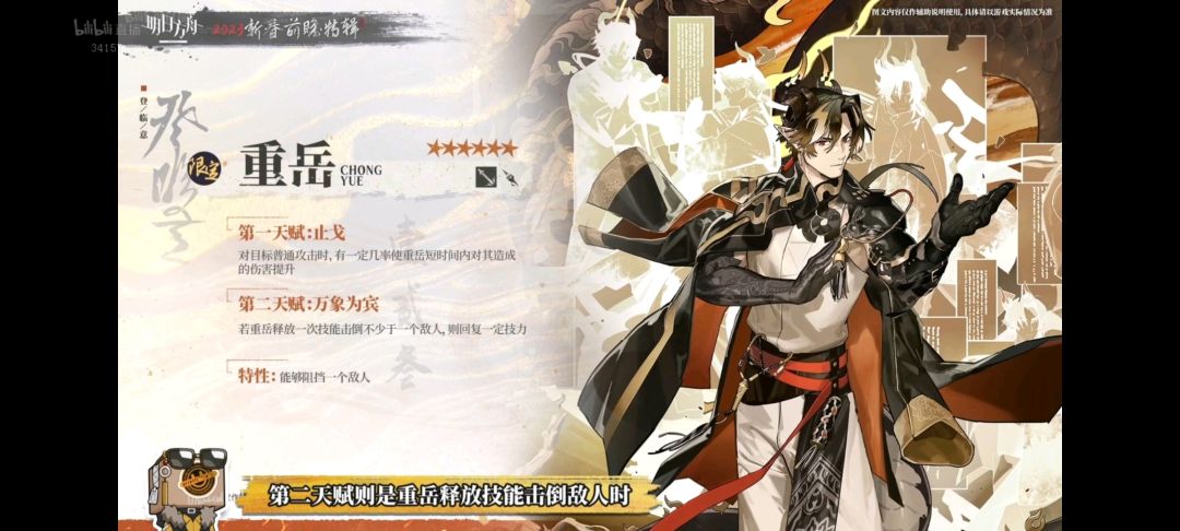 重岳一天赋“止戈”源于“止戈为武”,意为“只 有放下武器时也能使人信服,才算是真正的武功。 在动画pv当中,大哥的剑未被他拿起过,或许曾经 他把栏杆拍遍,或许曾经他让剑上染满敌人鲜血, 但他现在只想止戈,化于戈为玉帛,让玉门的百姓 也能享有安宁祥和的权利。