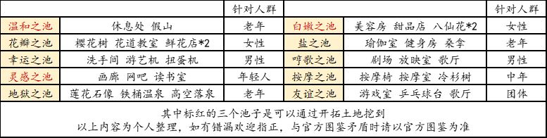 ·可以在温泉周围布置设施可以开发出温泉功效,会提升某一类人群的偏好,其中土地开发挖到泉眼,所有温泉可以获得功效,地里可以挖出来的有三种。泉眼挖出来以后不需要在周围布置温泉,只要挖出来,全图的温泉都能吃到那个功效。