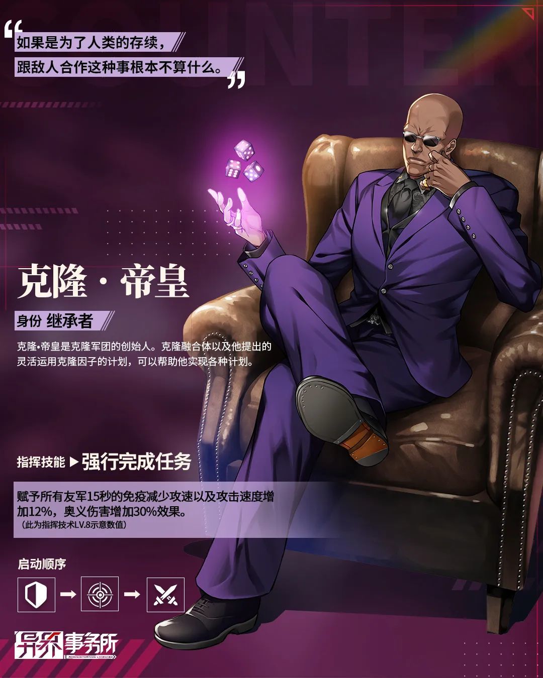 机务员克隆·帝皇的指挥技术将赋予己方一定时间内的免疫减少攻速的效果,同时将赋予增加一定的攻击速度、奥义伤害的效果。莫妮卡的指挥技术能够对所有友军赋予一定的增益效果,帮助己方提供有效的进攻能力。