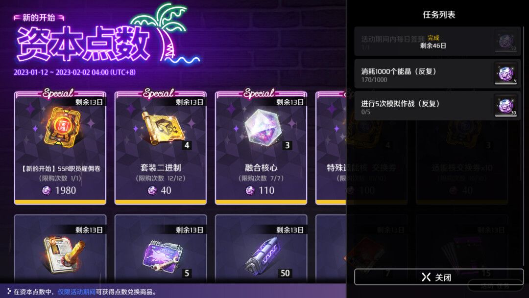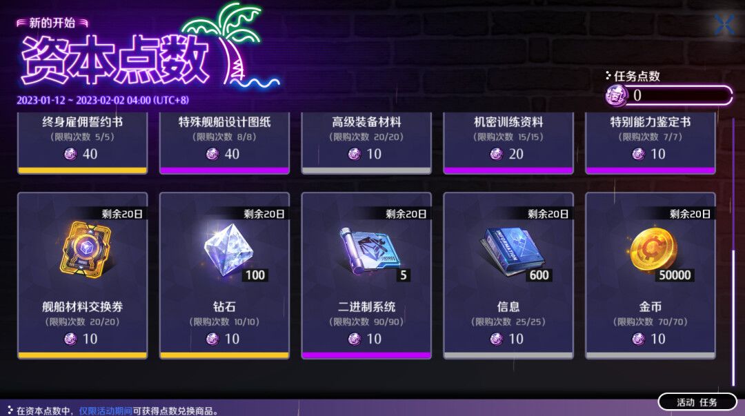 本周四更新维护后,管理局将面向各特遣势力公司开放全新的资本点数活动。完成点数任务将得到对应数量的资本点数,积攒一定数量的资本点数,将可以兑换到包括【[新的开始]SSR职员雇佣券】、融合核心、套装二进制、特殊适能核交换券、舰船材料交换券、钻石、金币等作战道具。
