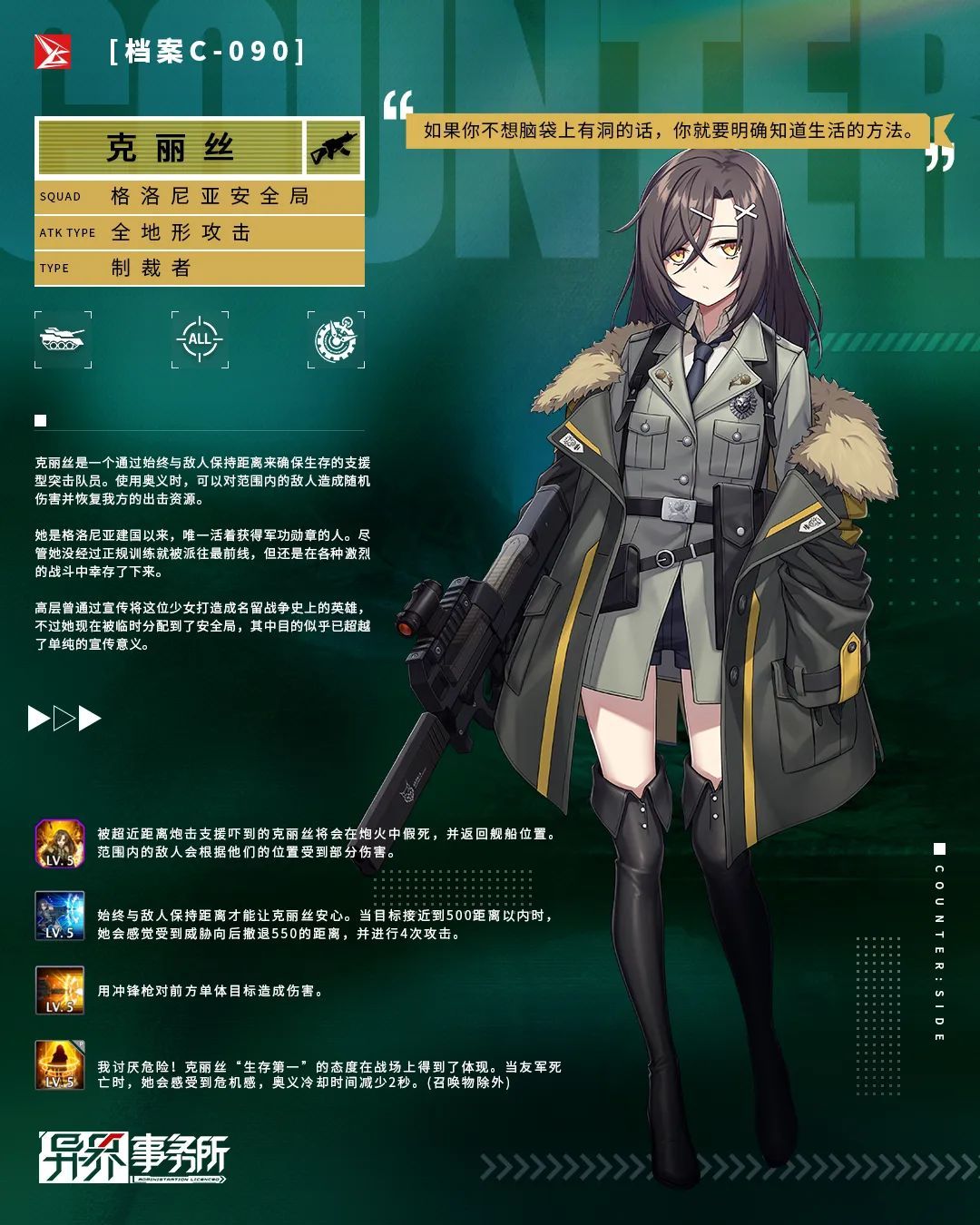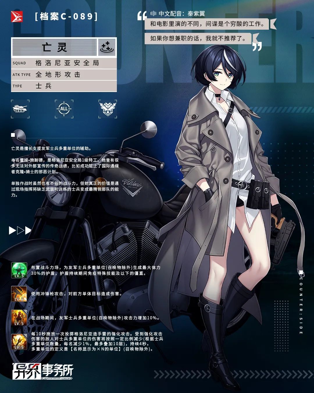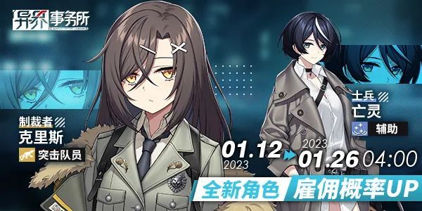 来自格罗尼亚安全局,在“狂欢节”中表现出色的SSR士兵“亡灵”以及SSR制裁者“克丽丝”将在本周四更新维护后实装,角色专属的雇佣概率UP卡池同步开放!
