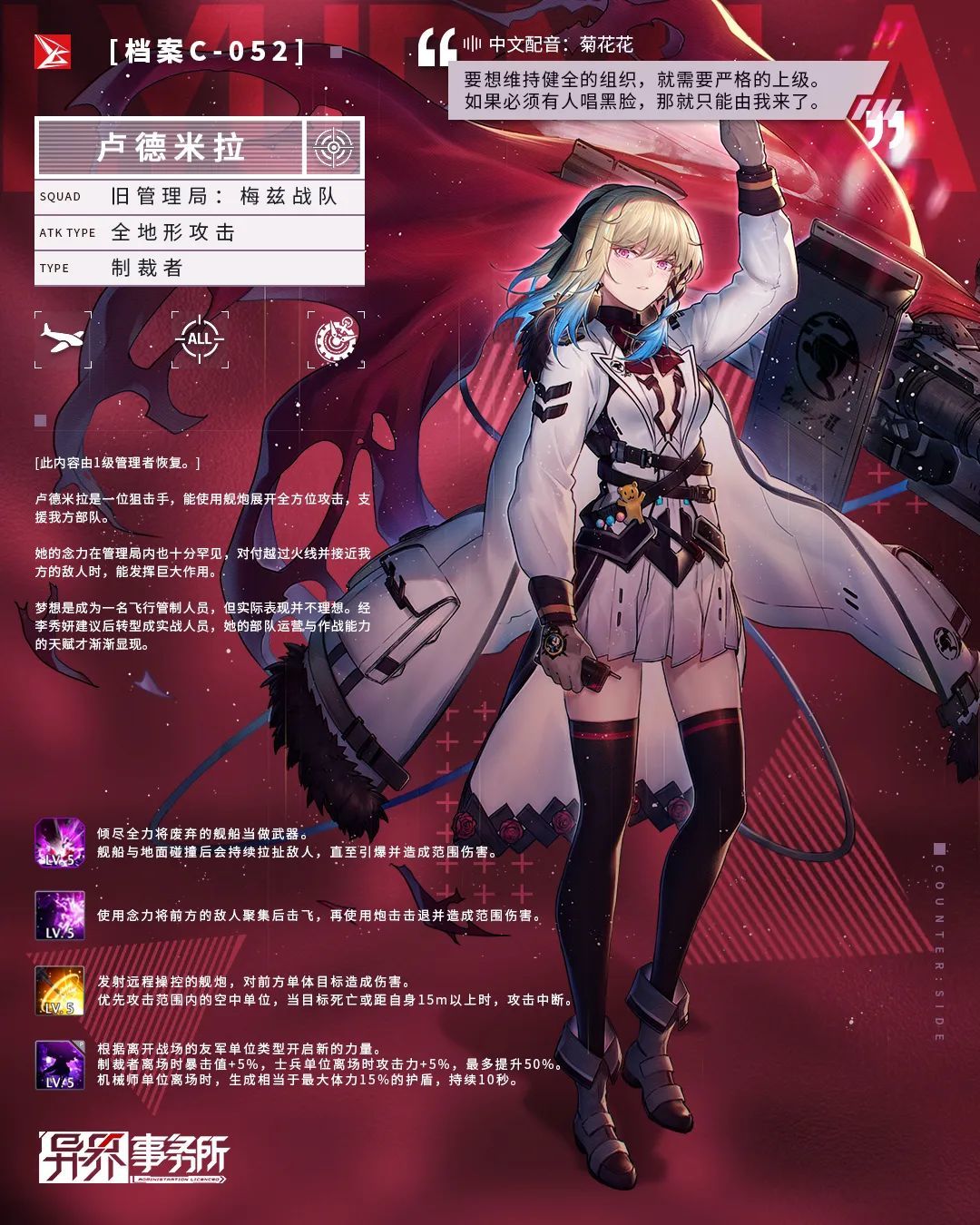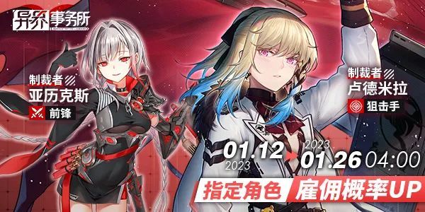 本周四更新维护后,管理局将为特遣势力公司开放旧管理局:梅兹战队角色“卢德米拉”以及“亚历克斯”的雇佣概率UP复刻卡池,她们始终活跃于外传“迷宫的尽头”教人亲眼目睹动人的壮烈。