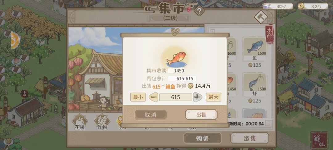 4.集市,卖各种东西,植物跟鲤鱼很nice。鱼直接卖有点吃亏,最优是最成菜,其次卖肉,最后才是卖整鱼。我嫌麻烦直接卖整鱼。