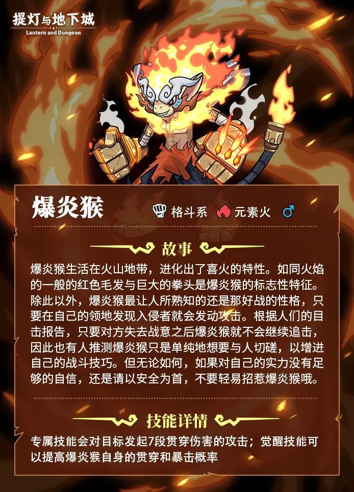 爆炎猴常年栖息在火山地带,进化出了喜火的特性,时常斗志满满的找人切磋,提灯者有兴趣的话可以跟他过上两招~!