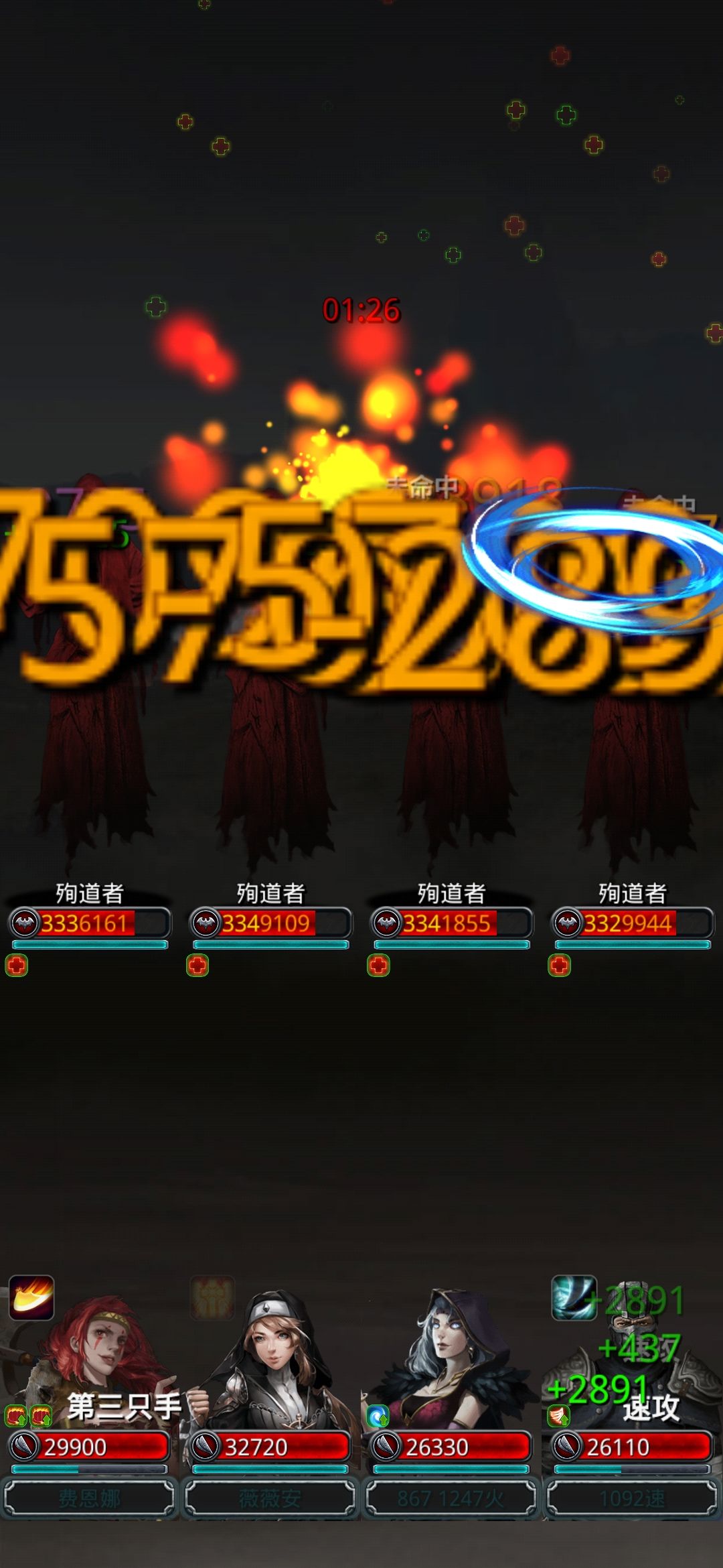 开局火邢经常收割最低,圣光始终奶,火法100奶经常炎爆最低,夜魇连击最低(这里火邢祭祀火法都带先发)。我的操作是火邢到第二次收割之后调为剩余最高,然后调夜魇剩余最高,最后火法。这里火法第一次不增幅的情况下伤害也够。