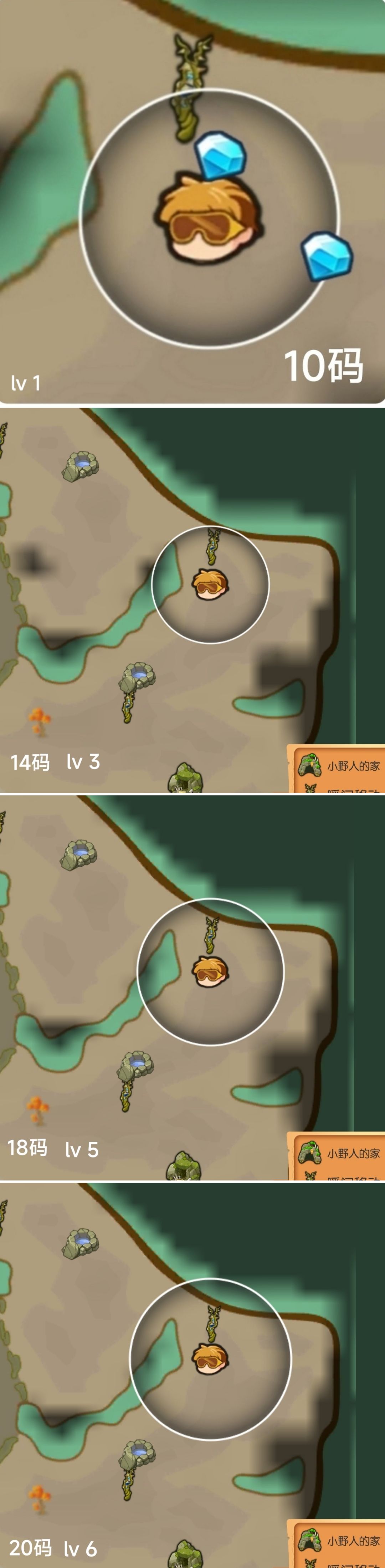 上面讨论了概率和范围的问题,然后就想说明一个目前游戏尚未优化的弊端。我一开始以为面具升级后就可以在跑图时更快更多的发现钻石,提高收集钻石的效率。事实也确实如此,升级后范围更大能发现更多的钻石,但是目前存在的一个问题是,我们在小地图上显示的视野范围是固定的,变大的是放大后大地图的范围,所以我们在跑图时能看到的小地图显示范围是比我们实际能看到的范围小一圈的。这个问题在4级以前并不明显,4级以后问题就变得明显,本来在地图上能探测到的钻石在小地图上却看不到,跑图时如果一下打开地图一下关上,不听重复是很影响效率的。具体可以参考下图: