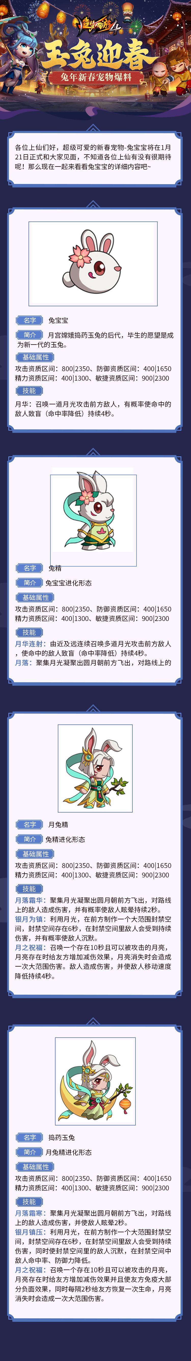 各位上仙们好,超级可爱的新春宠物-兔宝宝将在1月21日正式和大家见面,不知道各位上仙有没有很期待呢!那么现在一起来看看兔宝宝的详细内容吧~