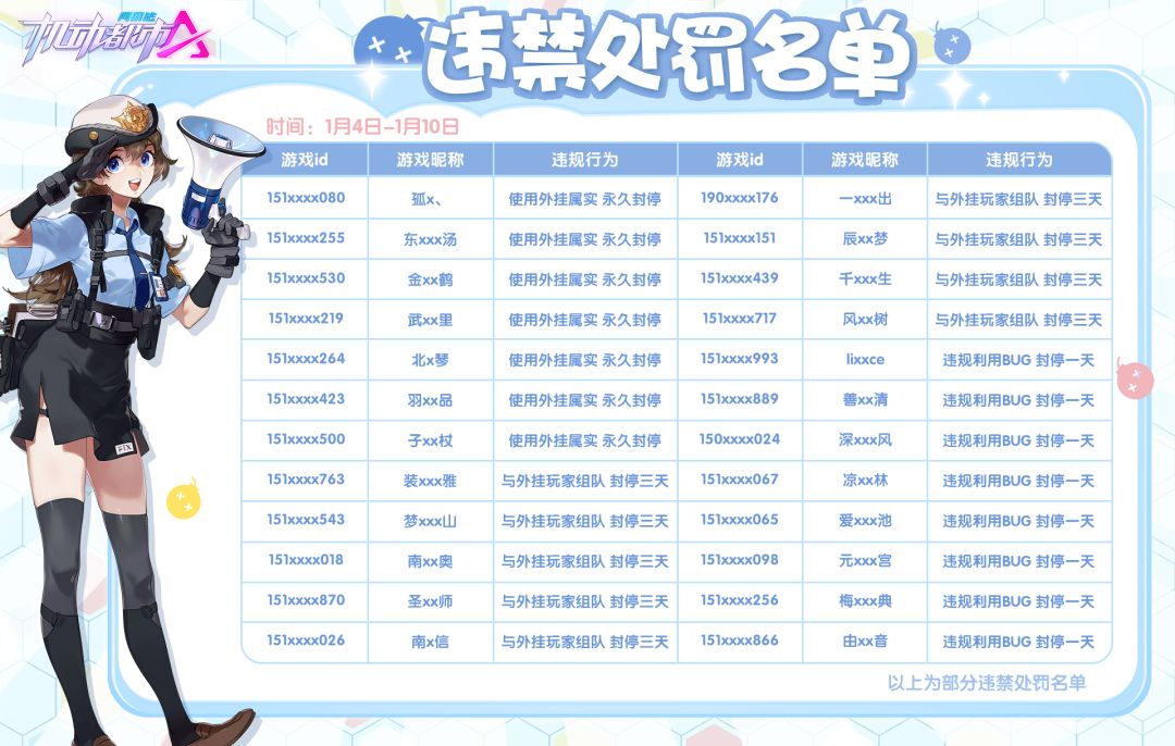 现将1月4日-1月10日的部分违禁处罚名单进行公示: