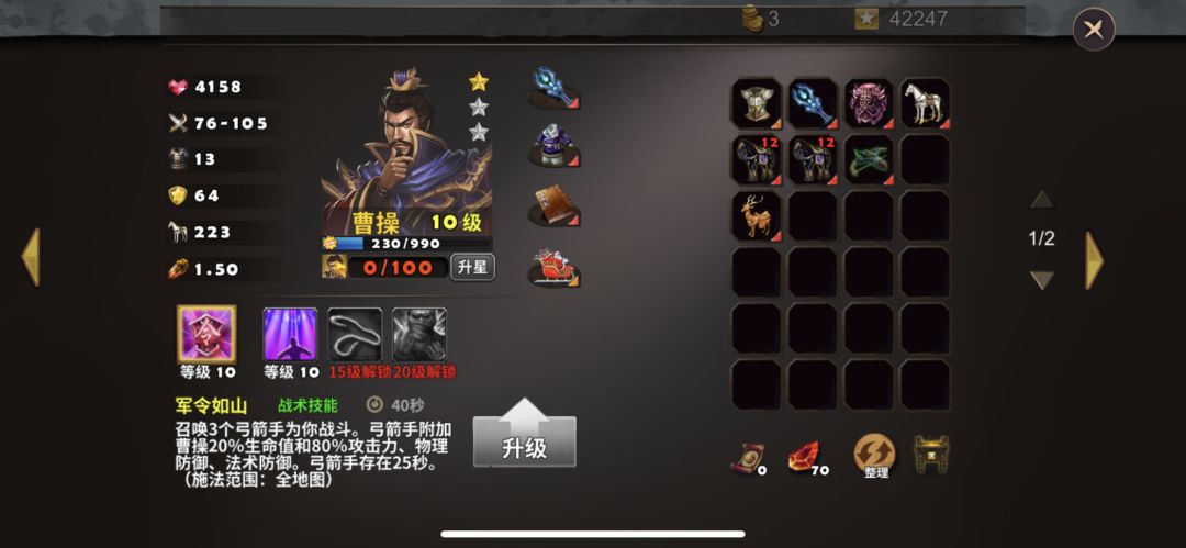 这关首次打只能使用曹操、夏侯惇,因为我没有其他曹营英雄,能不能使用其他曹营英雄现在还不知道,曹操、夏侯惇装备如图所示