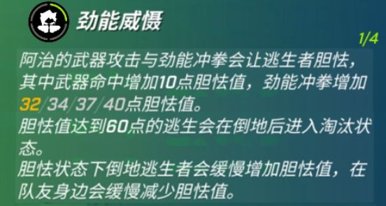 被动天赋-劲能威慑-阿治的武器攻击与劲能冲拳会让逃生者胆怯,武器命中增加10点胆怯值,劲能冲拳增加32/34/37/40点胆怯值。胆怯值达到60点的逃生会在倒地后进入淘汰状态。胆怯状态下倒地逃生者会缓慢增加胆怯值,在队友身边会缓慢减少胆怯值。