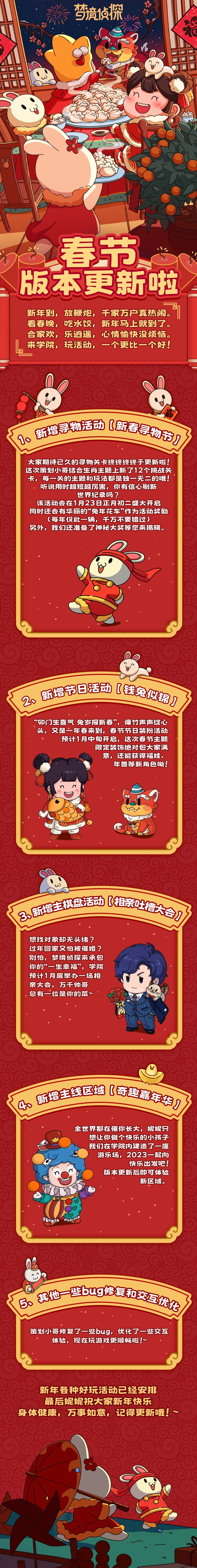 春节版本今日正式上线!版本新增【新春寻物节】、【钱兔似锦】、【相亲吐槽大会】三大活动,新增主线区域【奇趣嘉年华】,同时修复了一些游戏BUG,优化了游戏交互体验,现在玩游戏更加顺畅啦!新年各种好玩活动已经安排,大家记得更新呦!