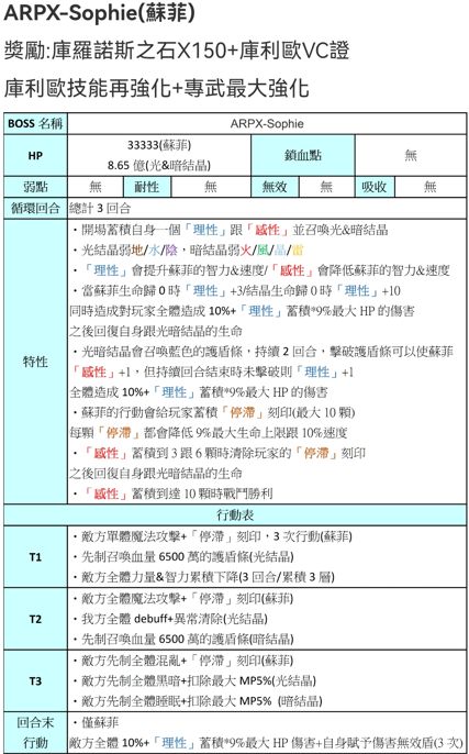 而且应该尽量避免在攻坚过程中失手打死苏菲,这样会触发特性(表中有注明)