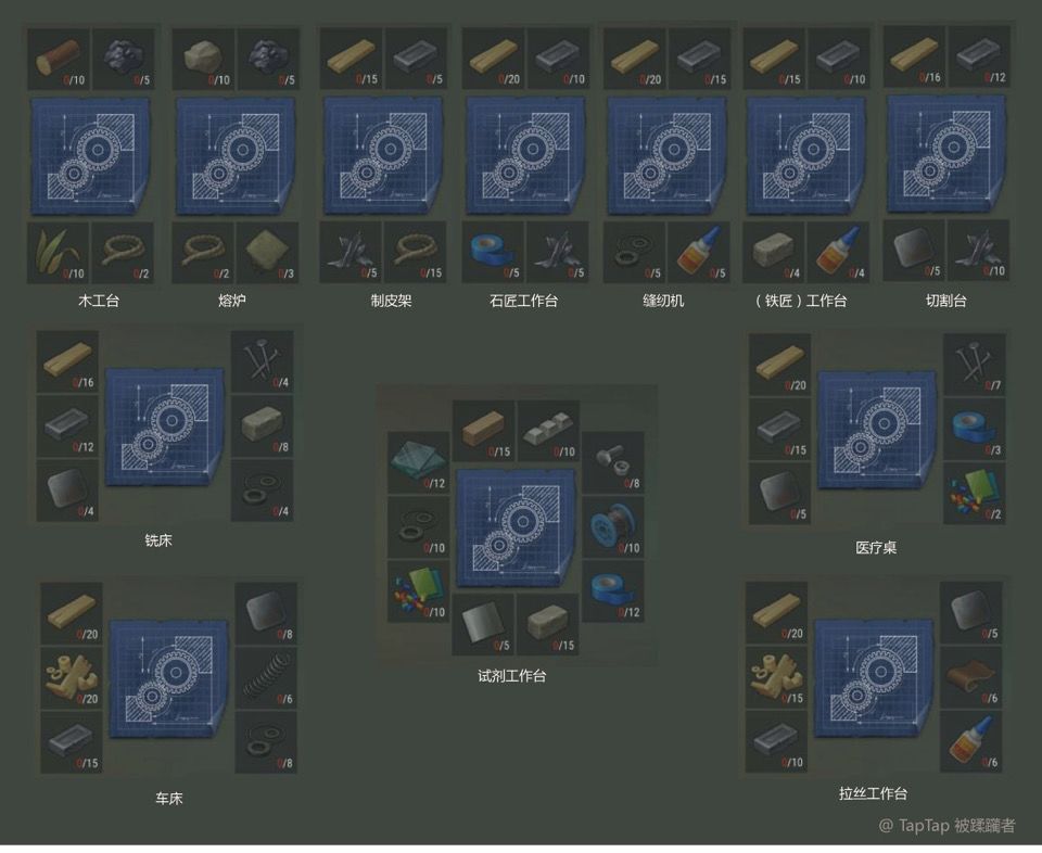 老萌新也贡献一篇攻略。首先恭喜地末在弹坑转型成为模拟经营游戏。就不多说了。目前版本共有可制作的工作台12个,本篇整理了它们的各类数据供大家参考。
