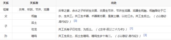 《山海经 · 海内经》:“炎帝之妻,赤水之子听袄生炎居,炎居生节并,节并生戏器,戏器生祝融,祝融降处于江水,生共工。”