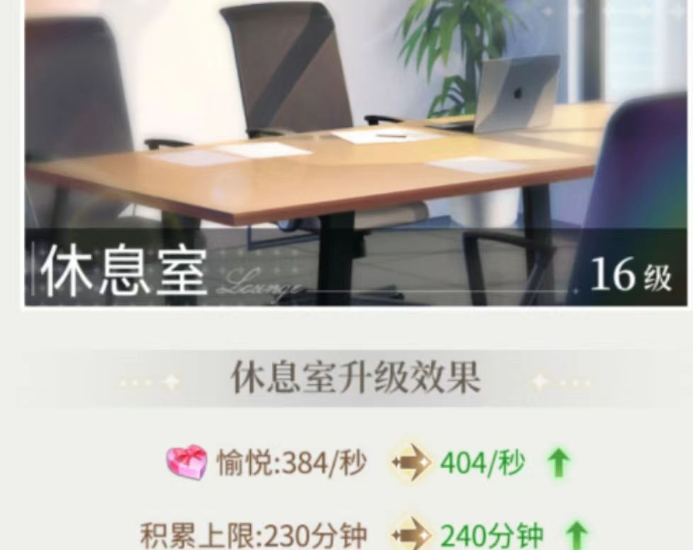 4.最重要的也就是获取愉悦值的休息室啦,对决胜利会获得道具鸡腿,鸡腿可用于休息室升级,休息室等级越高获得的愉悦值也就越多,等级越高休息室储值上限也会提升。休息室是我们获取愉悦值的重要地方,大家也要记得及时领取休息室的愉悦值领取,因为到达积累上限就不会再自动储存了。