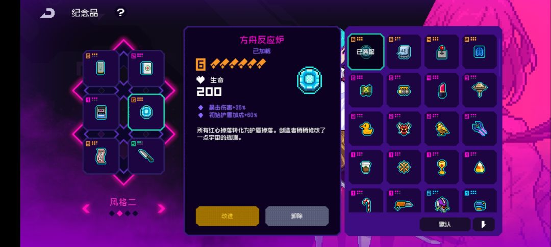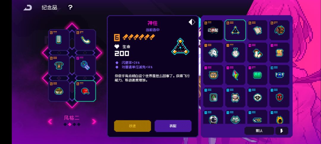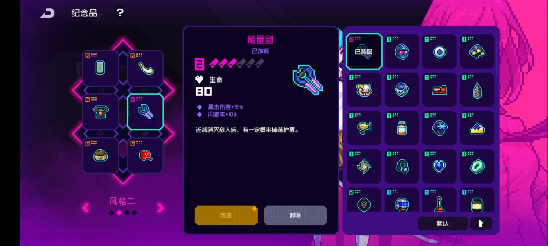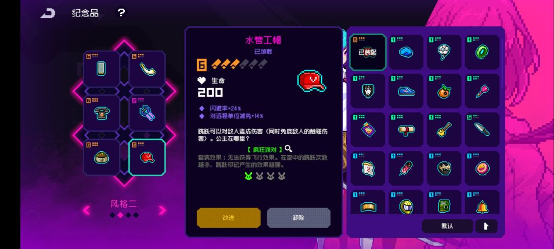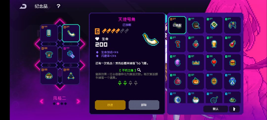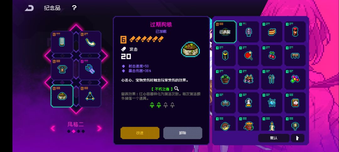近战二号位可以换天使号角,五号位可以换狗粮。天使号角狗粮搭配后期可以满屏飞心飞盾。而且狗粮增加暴击,号角增加闪避。四号位可以换能量剑。六号位可以换水管工帽