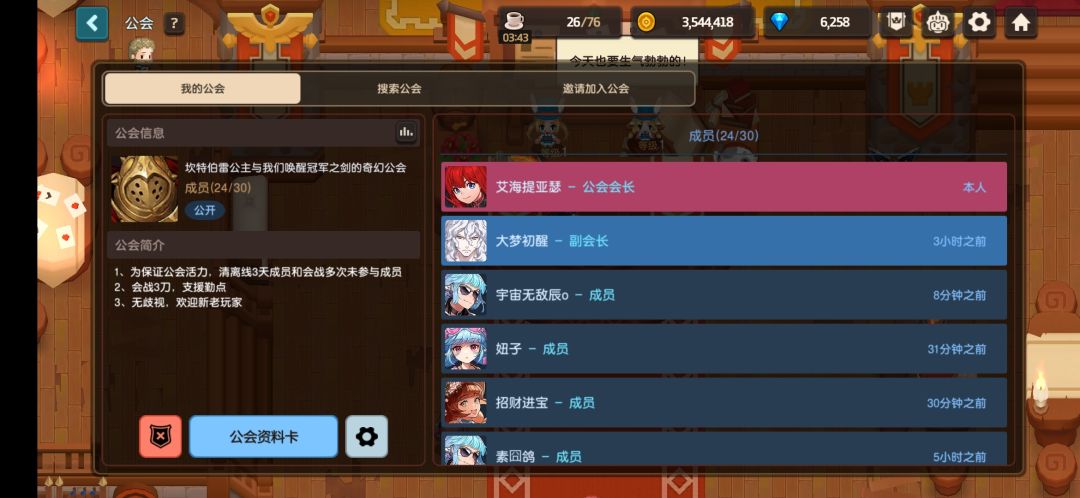 公会收人了来长期要稳定大佬,目前公会都是小时内在线22人