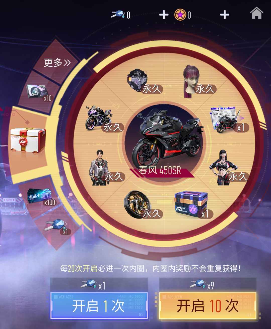 『骑士宝库』1月13日限时上线全新活动-骑士宝库,车手们可以使用“春风钥匙”进行抽奖,每次抽奖都有可能触发超级奖励,每二十抽必触发一次超级奖励,超级奖励不会放回,每次触发都有几率直接获得春风 450SR!在骑士宝库奖池中,除了全新登场的春风 450SR外,车手们还有几率抽取到骑士套装-自由声浪、动效轮毂-风火轮、骑士头盔等稀有奖励,让你的骑行之旅足够安全舒适,同样时尚迷人!