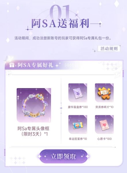 福利一:自12月31日起,新来到A市的三小姐均可获得包含「阿Sa专属头像框(限时3天)」在内的专属礼包!