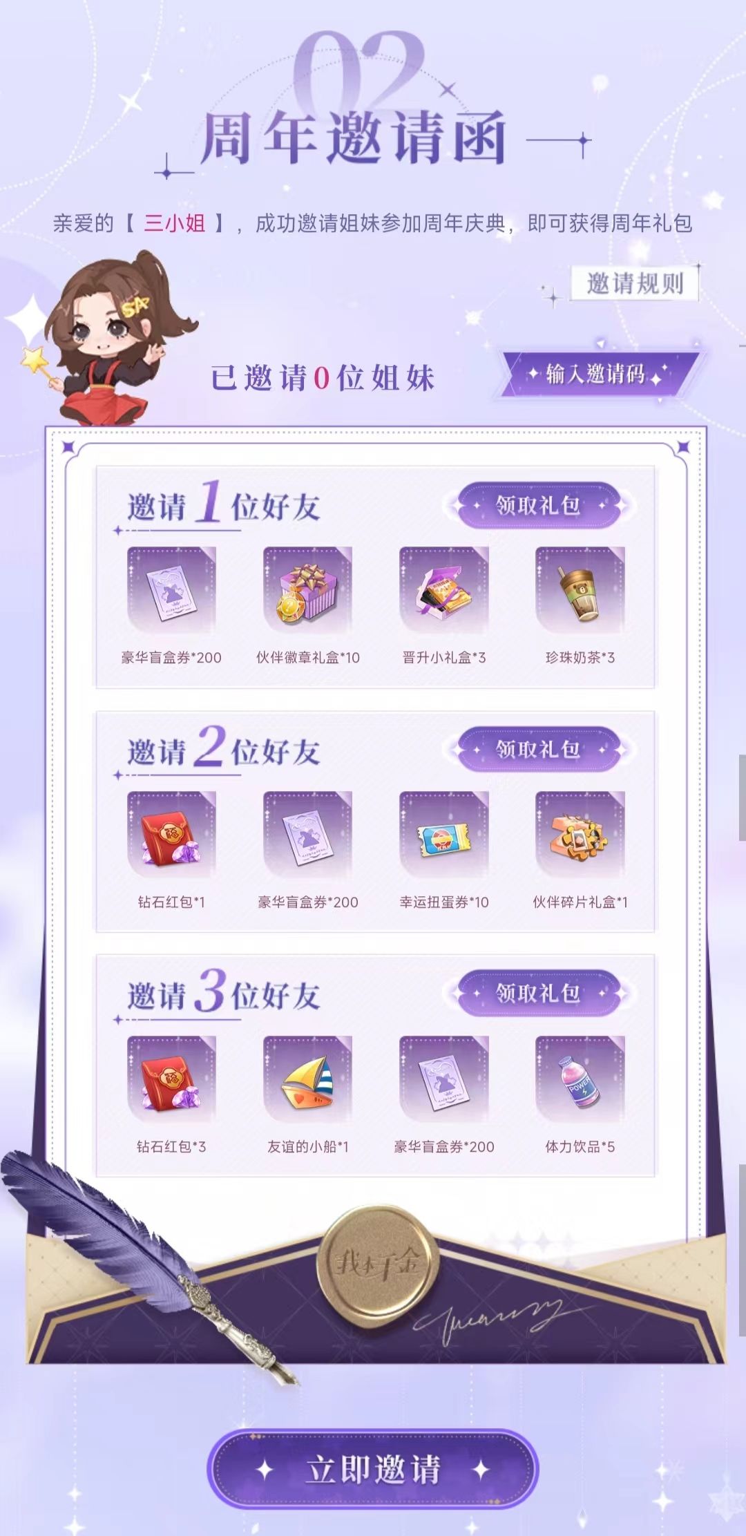 福利二:《我本千金》即将一周岁啦!三小姐成功邀请姐妹参加周年庆典,即可获得周年礼包奖励!