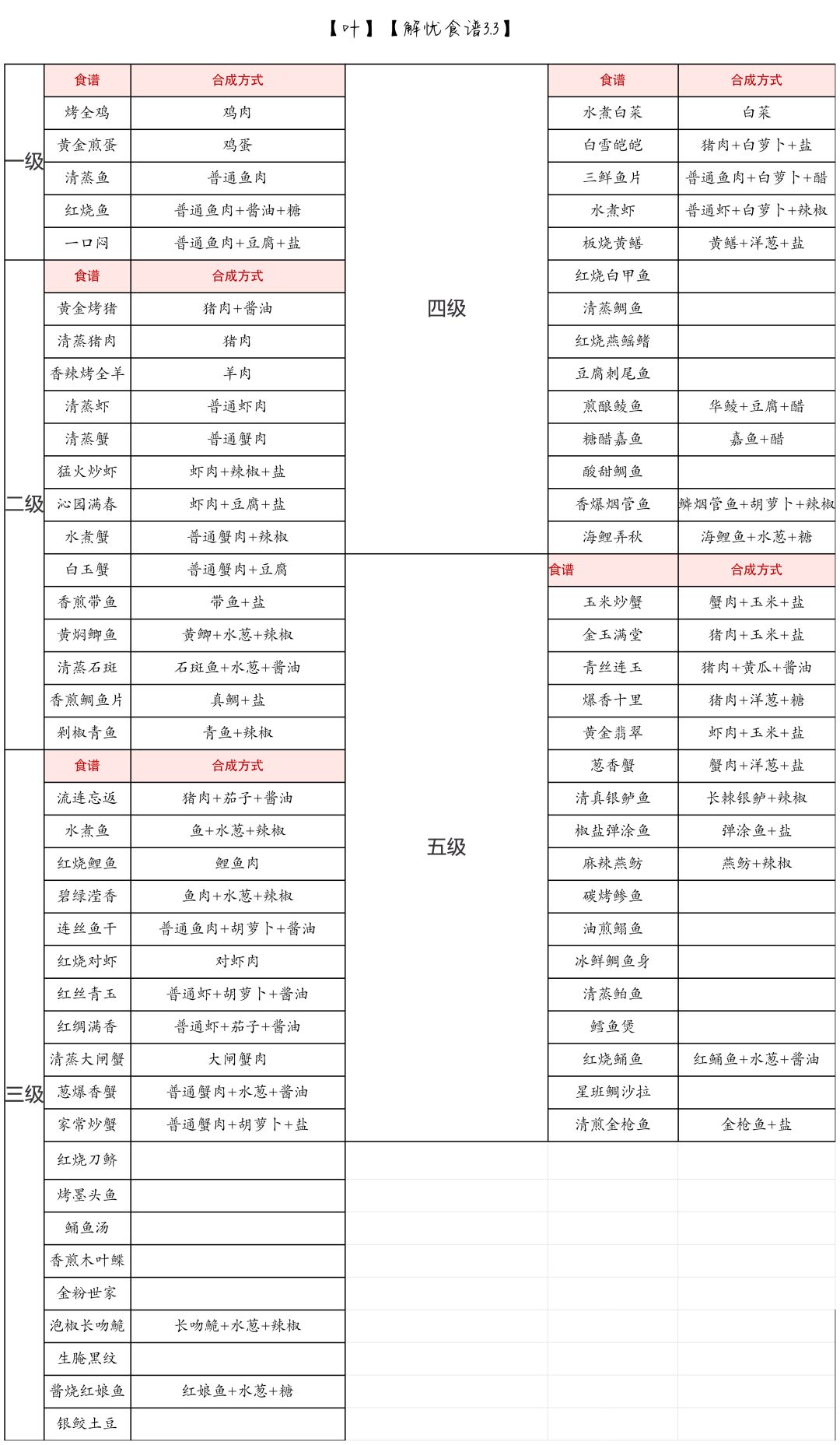 优秀玩家叶的菜谱攻略: