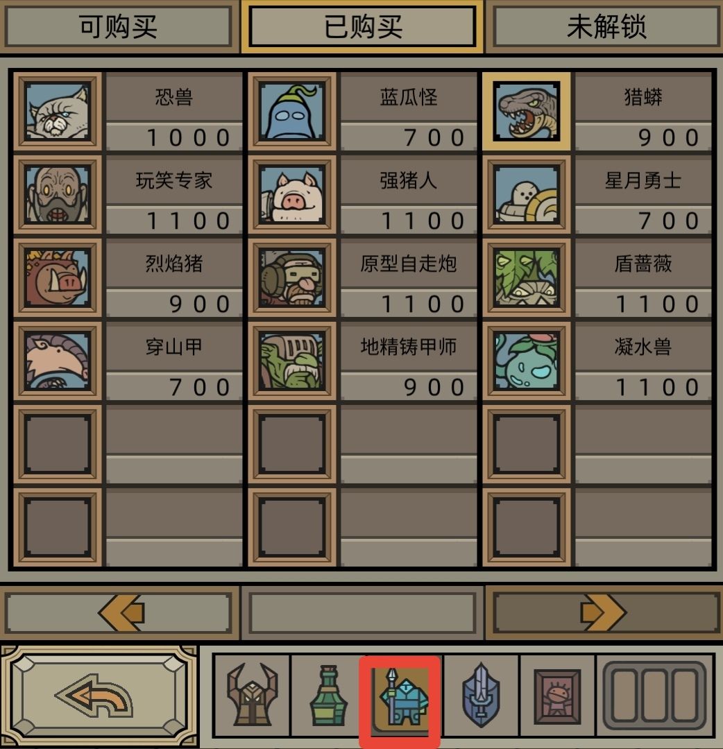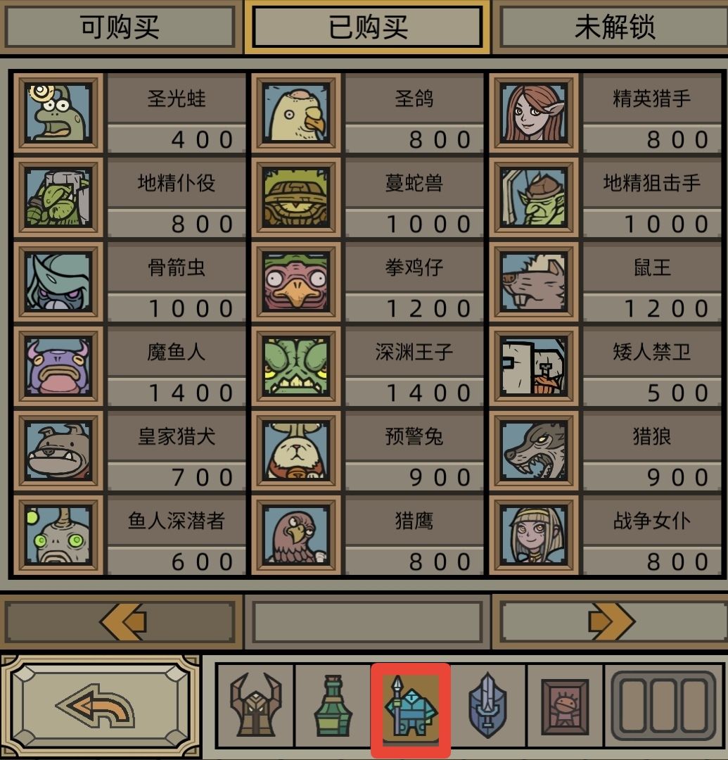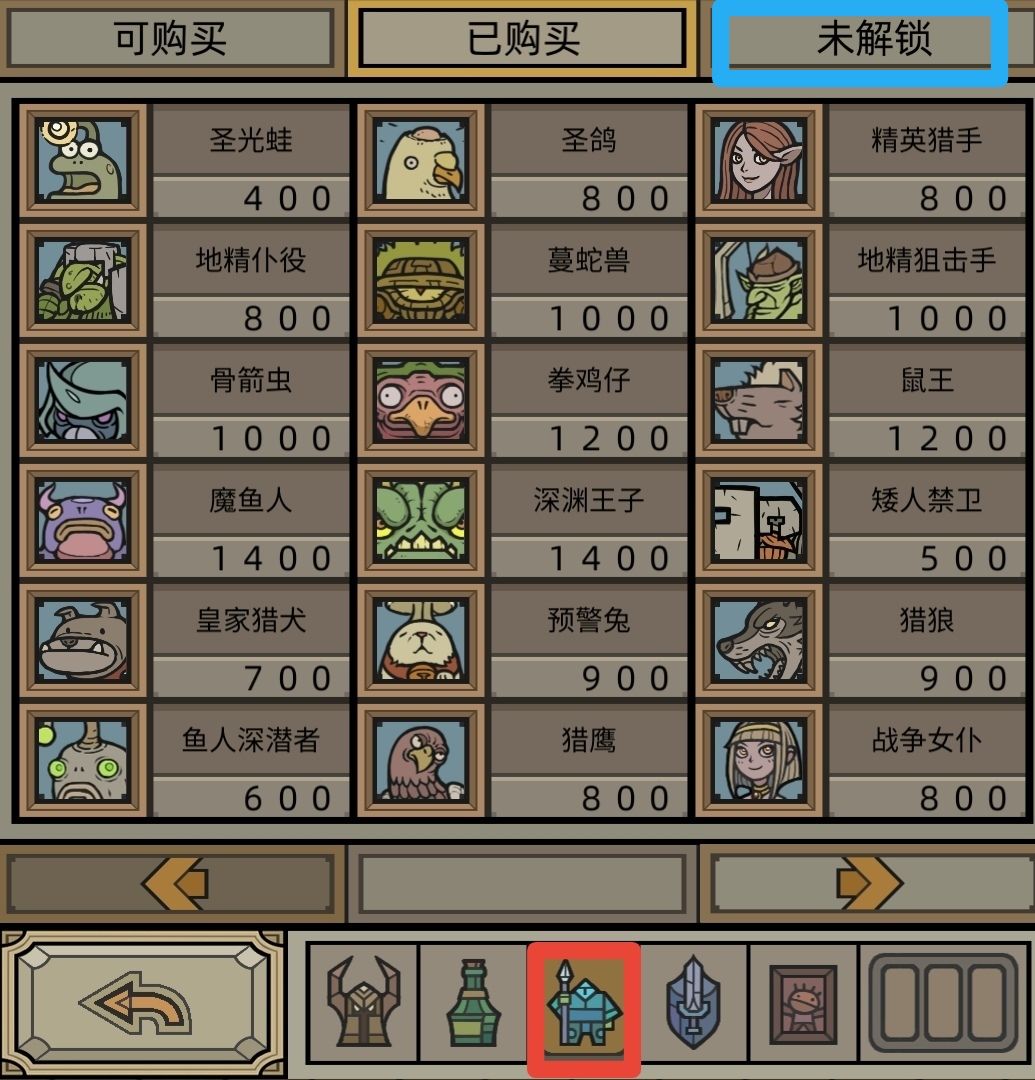 答:进入商店后,点红框位置的图标(下面的图片是全部解锁后的我方护卫单位)。