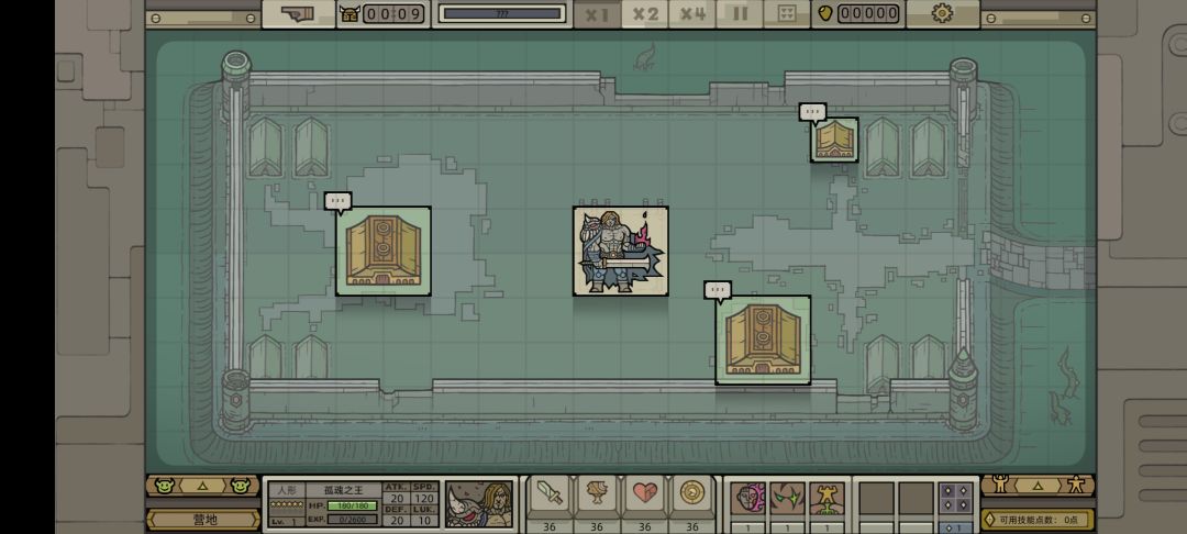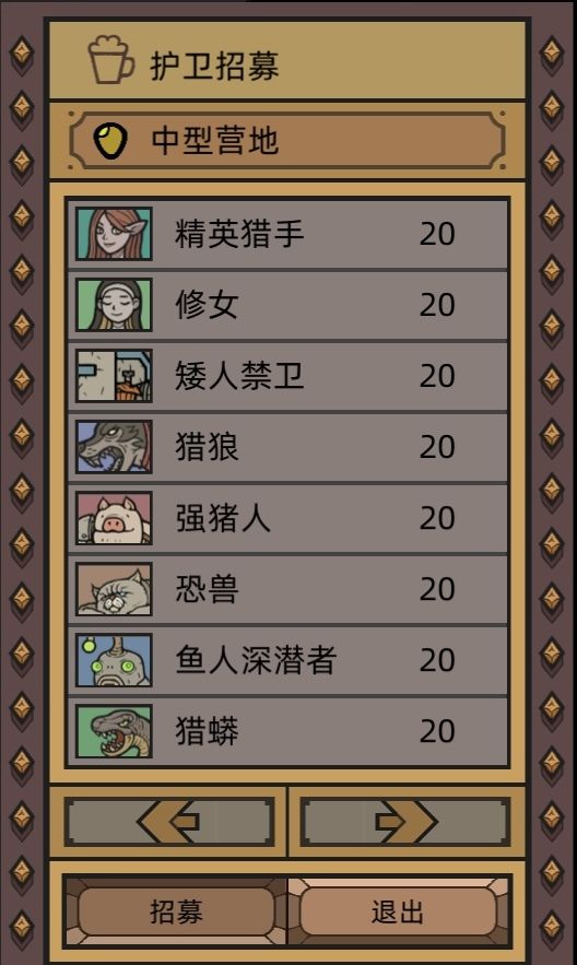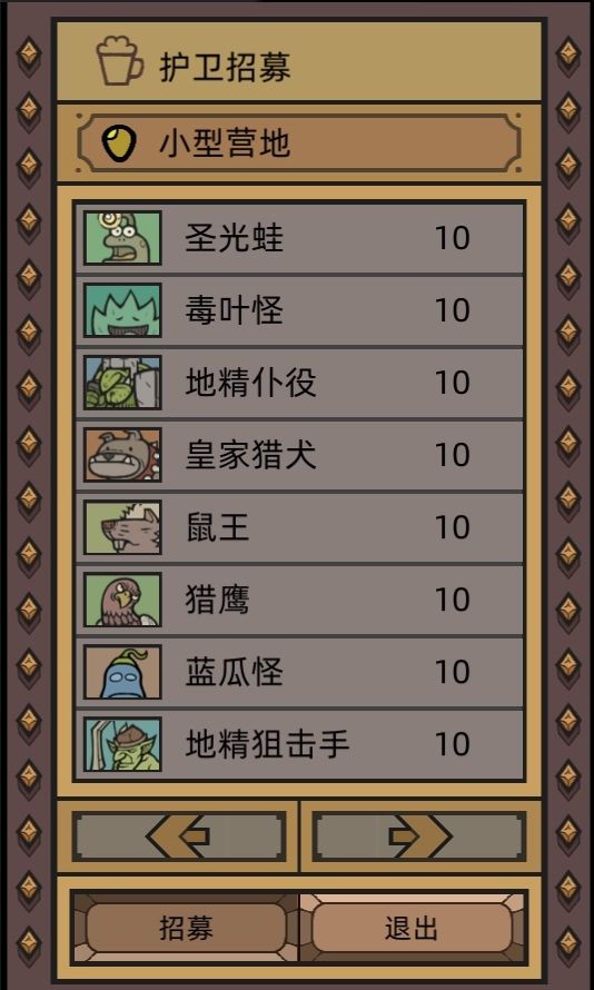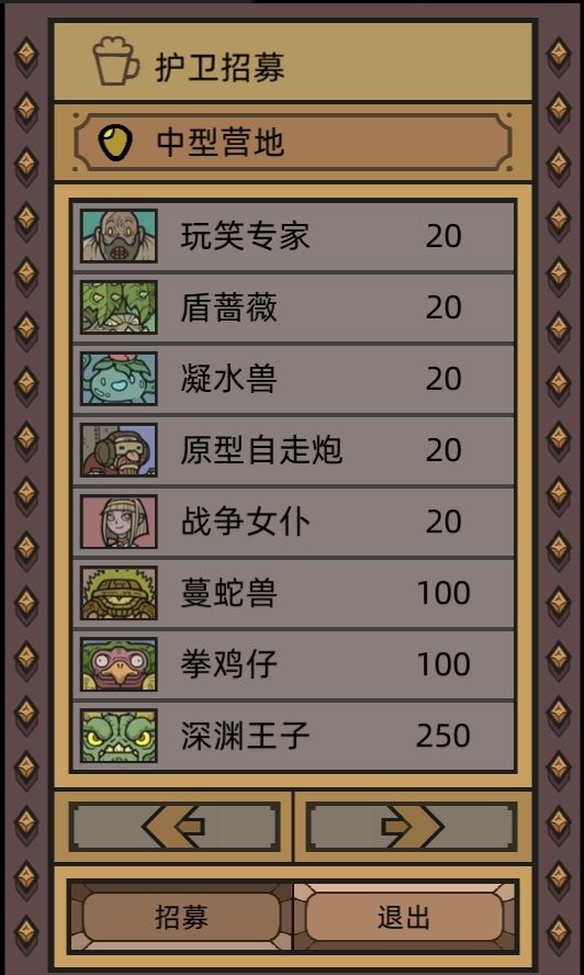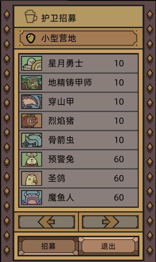上图中两个绿色区域的房子可供玩家招募初始的“护卫”单位。下面那个大房子是“中型营地”,上面那个小房子是“小型营地”。玩家接触相关区域后可以看到护卫列表,招募列表中显示的数字是“需要消耗的灵魂种子(商店里的货币)”。