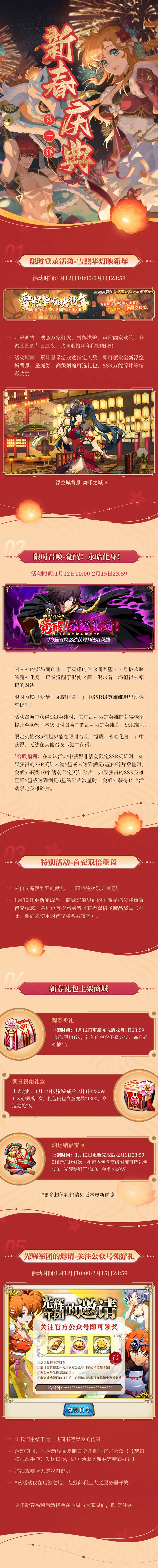 *召唤福利:在本次活动中获得非活动限定SSR英雄时,如果获得的SSR英雄未满6星或未达到满足6星的碎片数量时,会额外获得10个活动限定英雄碎片;如果获得的SSR英雄已经6星或达到满足6星的碎片数量时,会额外获得15个活动限定英雄碎片。
