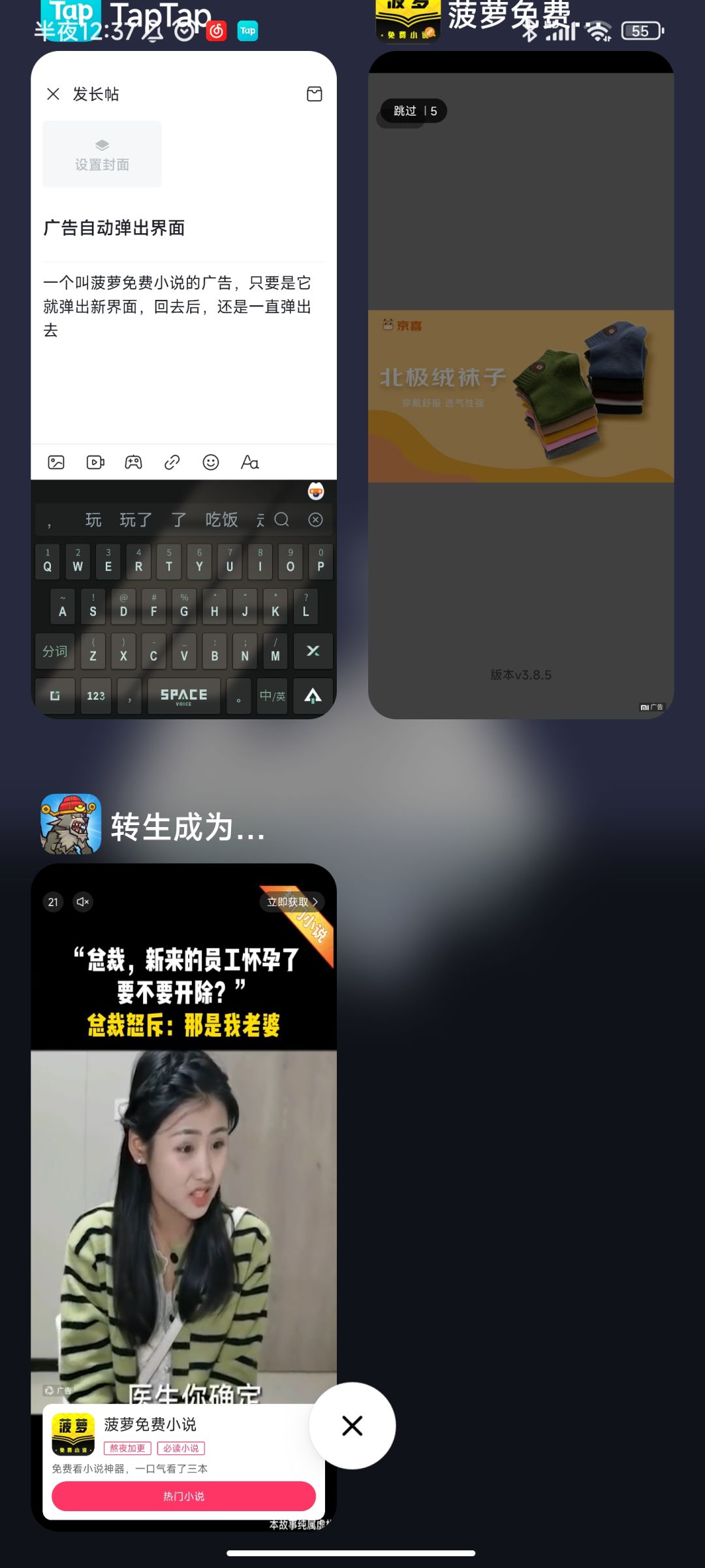 一个叫菠萝免费小说的广告,只要是它就弹出新界面,回去后,还是一直弹出去。什么毛病啊?看的这个视频就得重新进游戏才行很影响游戏体验呀!官方大大这个改一下吧!