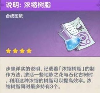 浓缩树脂:可以在激活古树或者地脉之花时用来替代原粹树脂使用,并且使用浓缩树脂激活的副本可以收获额外奖励,每天没有消耗完的原粹树脂可以制作成浓缩树脂储存起来,最大化的利用上原粹树脂,浓缩树脂的图纸在璃月声望达到3级之后可以于璃月总务司干事小雨那里领取。40个原粹树脂可以合成1个浓缩树脂,每次最多可以储存3个。