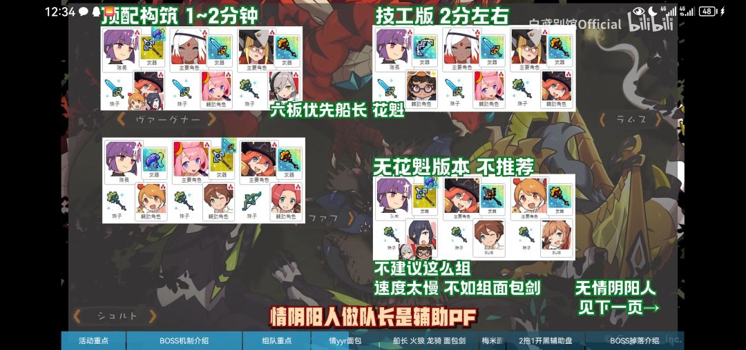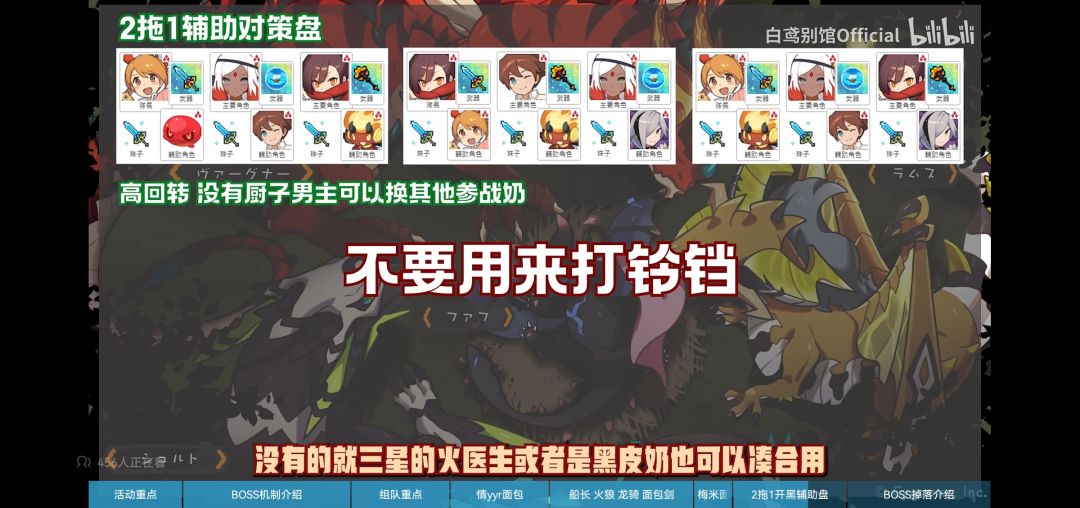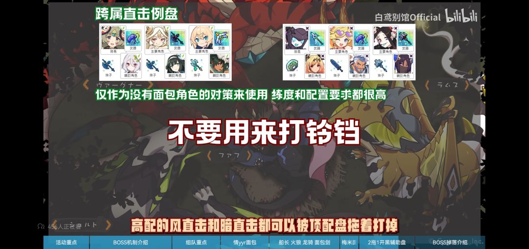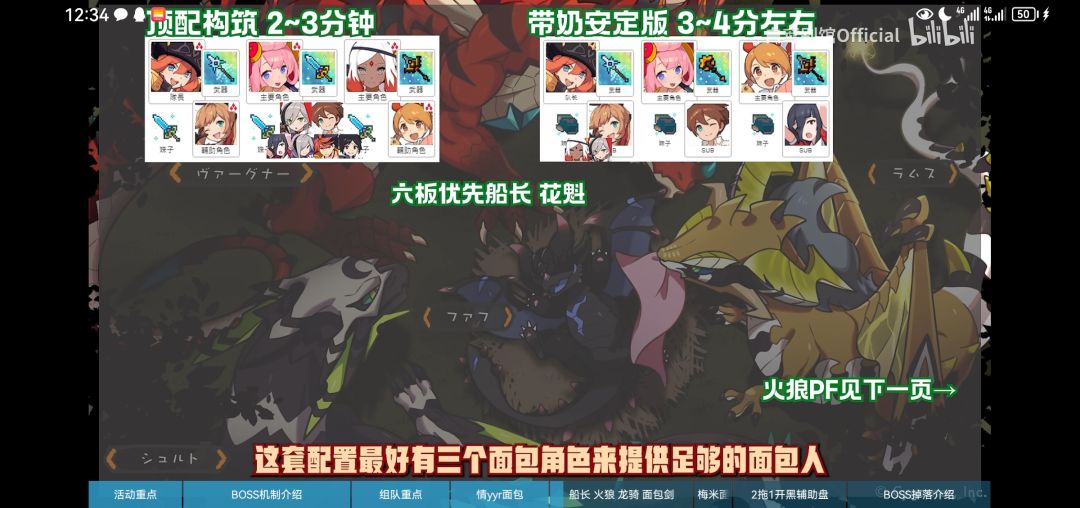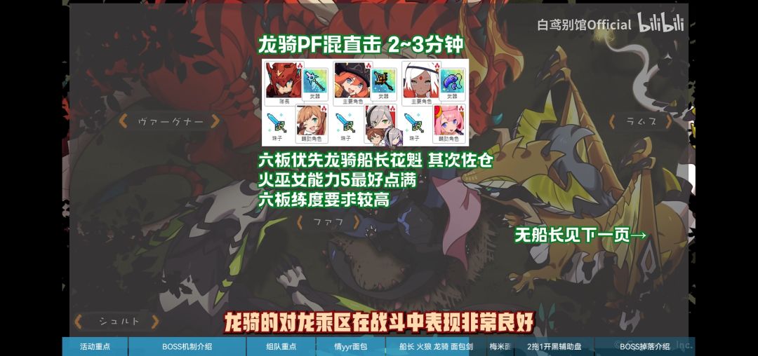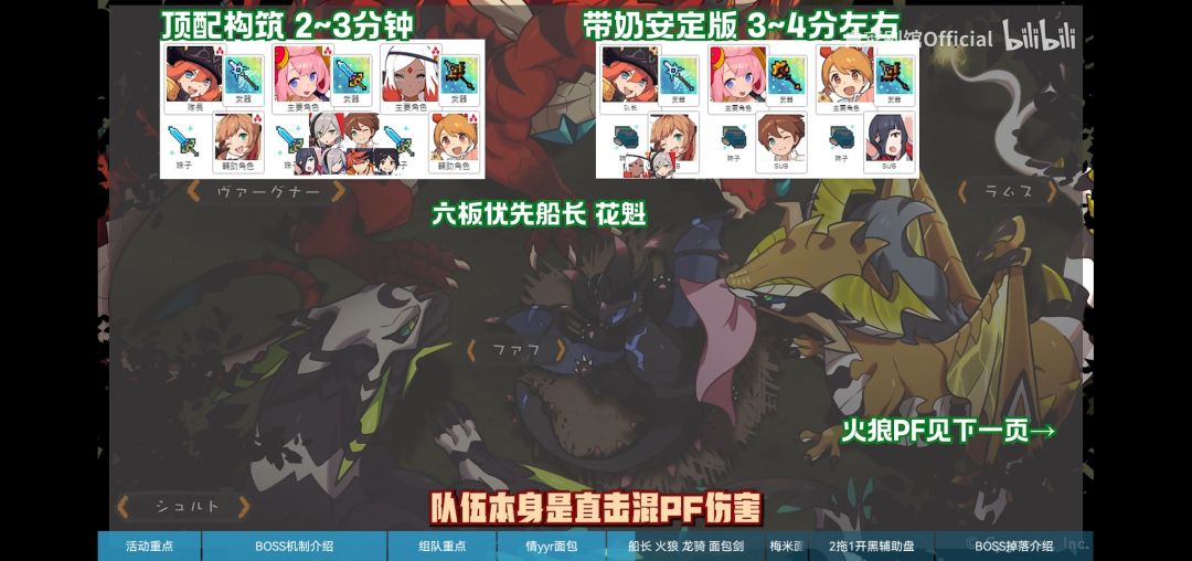 由于风荒龙的机制无法踢罐以及直击任务的存在,所以本次活动的推荐配队基本围绕着花魁,船长以及即将实装的白色情人节限定角色情yyr等面包角色来构筑,通过大量的面包完成boss的直击任务,但是由于面包队伍爆发输出较低以及boss的难度较高等因素,所以超级难度的boss基本通关时间都在三分钟左右