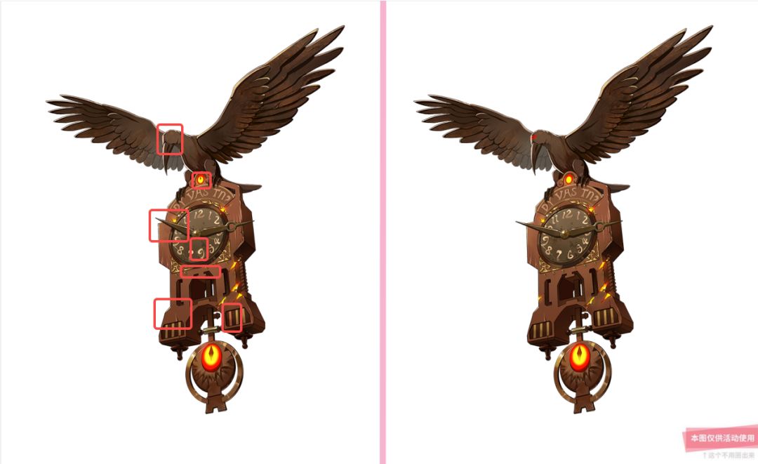 找出两个傀化钟的不同之处(共7处,仅在一边圈出即可或使用文字描述皆可),并回复至本帖评论区。