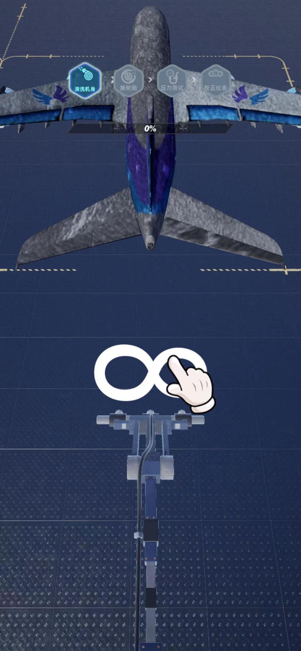 清洗机身—选择不同的溶液和工具,用手指滑动,让清洗物品将飞机全部清洗。清洗进度可以查看上方进度条,只需要70%的完成度就可以点击完成啦,偷偷告诉老板,通关奖励不会因为完成度的差距而有区别哦!