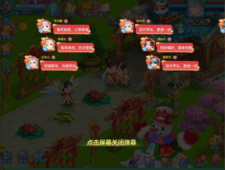 2)庭院祝福:1月12日维护后-2月1日24:00,前往其他少侠的庭院可进行许愿祝福,祝福后播放相应祝福弹幕,来为好友送上新年祝福吧!