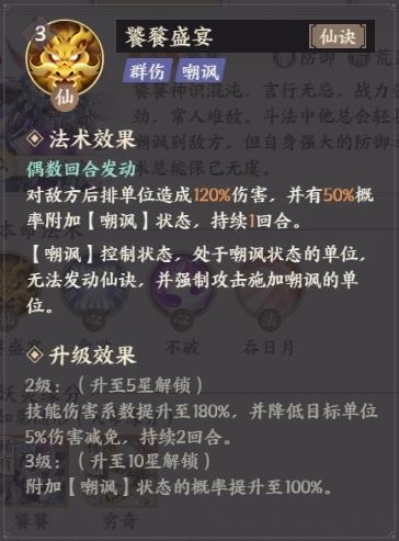 升星后提升技能伤害并降低目标单位伤害减免,必定嘲讽。仙诀大招可以频繁给敌方后排施加嘲讽状态,降低敌方妖灵输出效率。