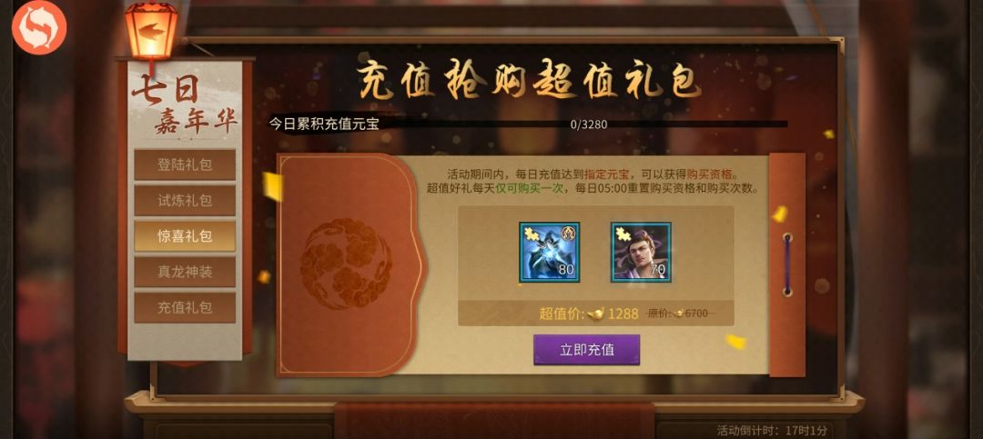 如果想充值,不用一上来就充,第一天充6元打开商船和单笔充值任意金额,第二天你的官邸到9级、10级,会蹦出充6元充东西,然后到11级和12级会蹦出充30元送东西(持续3个小时),再结合各种礼包一起,方天画戟也是需要充值30,鹅毛扇是类充150元。既然充值,就尽可能达到最大化。