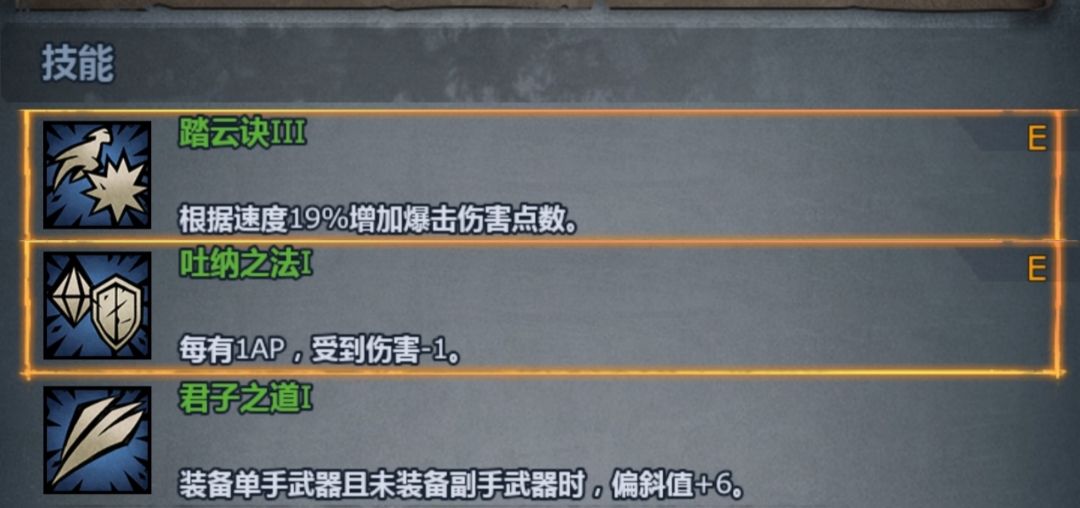 布甲神器建议使用行动力+1的布甲,武器用单手剑为佳(慎用奥维恩,太吃属性了)比较好搭配技能