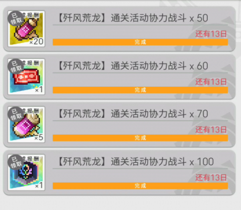 刚发现还没开始活动就已经完成了50-100的协力活动,问题是高级材料不确定,但是5星破晶和单抽卷我根本没拿到,背包里的数量没有变化。