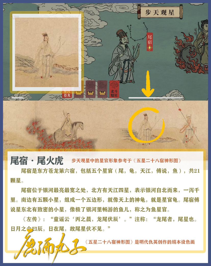 🌸尾宿位于银河最亮最宽之处,北方有天江四星,表示银河自北而来,一泻千里。南边有五颗小星,组成一个五边形,就像天上的神龟,就是星官龟。尾宿傅说星东北有致密的小星,像极了银河里畅游的鱼儿,称之为鱼星官。