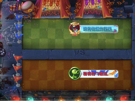 双人模式共有上下两个半场,各为3X13的战斗场地。上方区域为己方半场,下方区域为敌方半场。玩家需要在种植植物防守的同时,向对手放置僵尸。