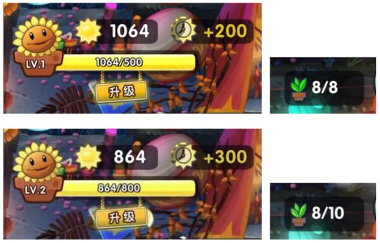 各位小僵僵还可以查看向日葵的升级进度条,当前阳光数目超过升级所需的阳光数时,可以消耗阳光升级向日葵基地,拥有更快的阳光生产速度,并增加植物的种植上限。