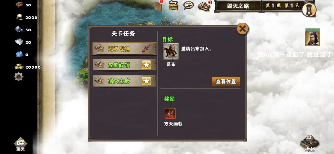 ❻、毁灭之路特殊任务:无双战神完成方法详解,其实这个任务特别简单,只要有吕布英雄令就可以,如果金币允许的话,可以在下邳之战过关的时候九折购买吕布英雄令,然后在关卡毁灭之路中,开局刘备对话吕布,选择吕布便可以完成任务,获得奖励1孔方天画戟