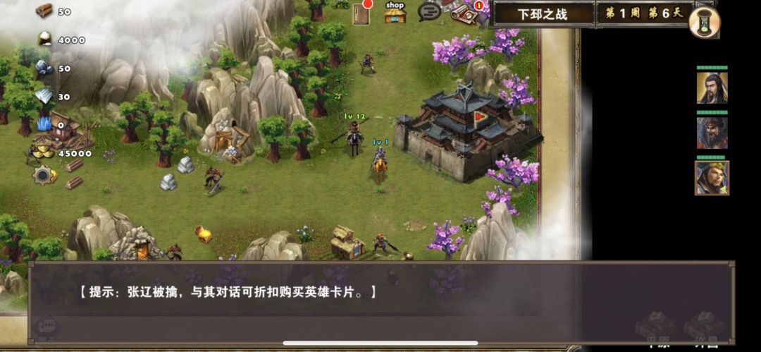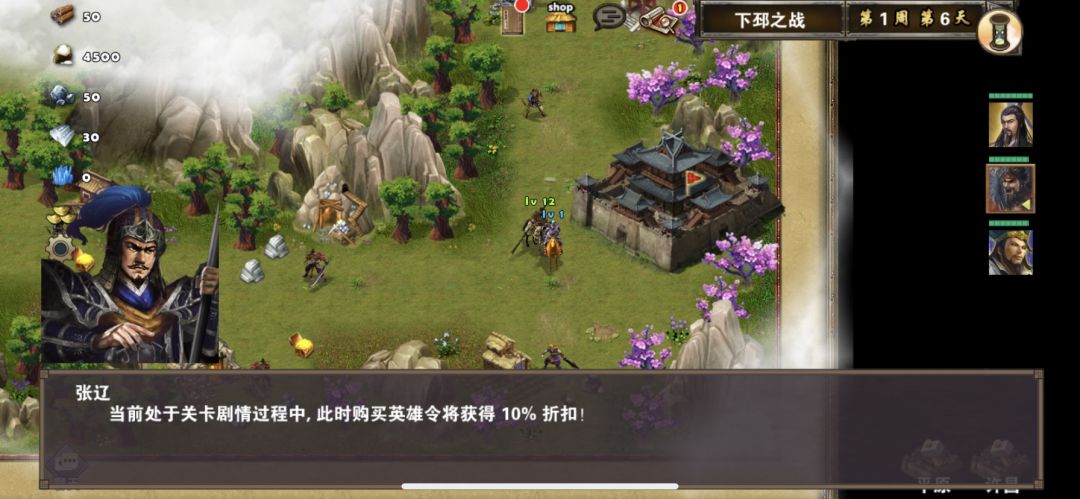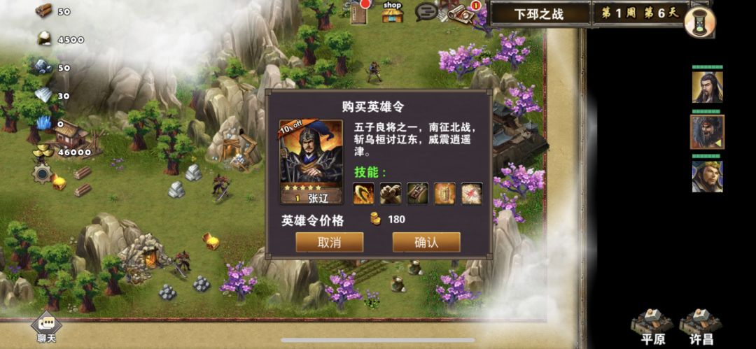 开局选择英雄的时候可以把诸葛亮放到第二或者第三个位置,这样诸葛亮开局便会出现在许昌城旁边,如果诸葛亮把附近属性建筑物都访问了,属性宝石都可以捡起来,当然如果觉得自己装备比较好,可以无视这些属性加成,然后一路往左走可以顺便打掉强盗首领(过关可以获得额外奖励,也可以不打,不过关也可以完成这个任务),差不多1周6可以看见张辽,诸葛亮直接过去打败张辽,然后张辽会出现在许昌城附近,我方任何一位英雄对话张辽便可以九折购买张辽英雄令,再次对话便可以完成任务,获得奖励