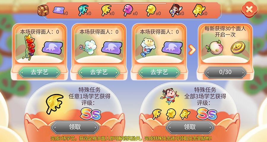 进入去学艺环节后,通过完成3场学艺去获得面人和评审券。