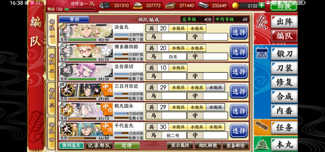 剩下4把都可以带刚回家数值喂满的35+极太,刀装水炮兵金银混搭,带北谷菜切是为了彩虹贝加成,因为打了8w了还没捞到日光一文字
